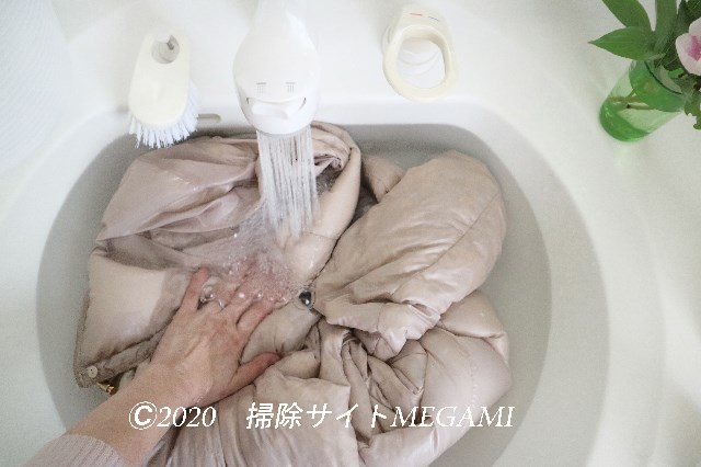 ダウンのロングジャケットの場合は、大きすぎて「洗面台や桶」で洗えませんよね。