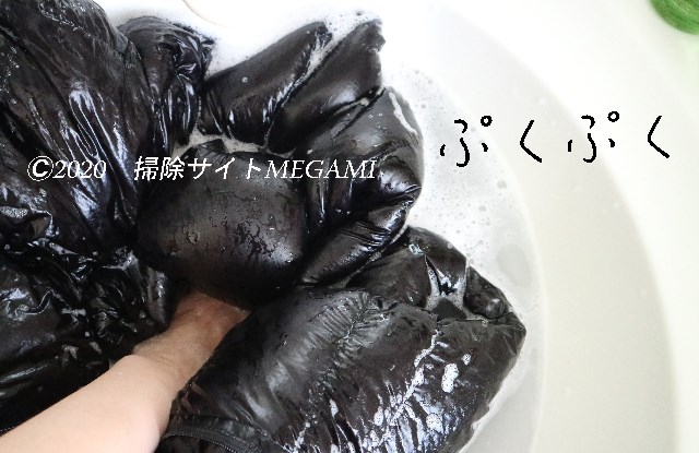 押し洗いするときに、ぷっくり膨らみ、泡がぷくぷく♪手に触れる感触が、とても柔らかくて気持ちよかったです。