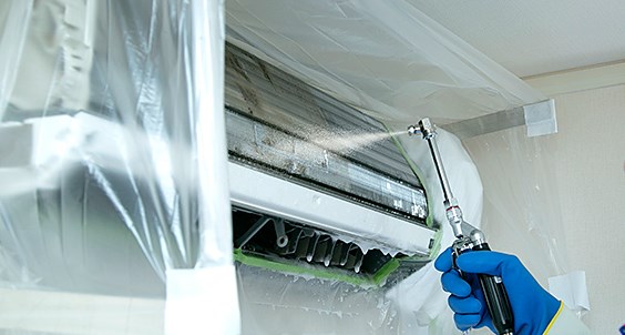 高圧洗浄機を使って、フィンやファンを洗浄。