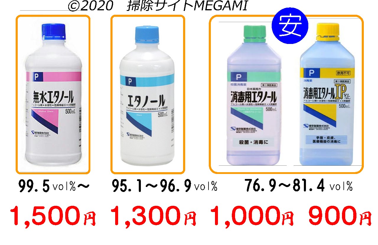 調査した店では、「無水エタノール」と「消毒用エタノールやIP」の差は、なんと500〜600円でした!