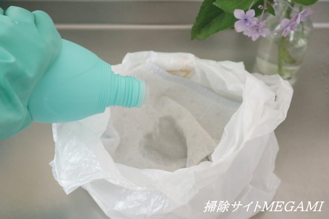 古布などを入れた袋に、ハイターを注ぐ。