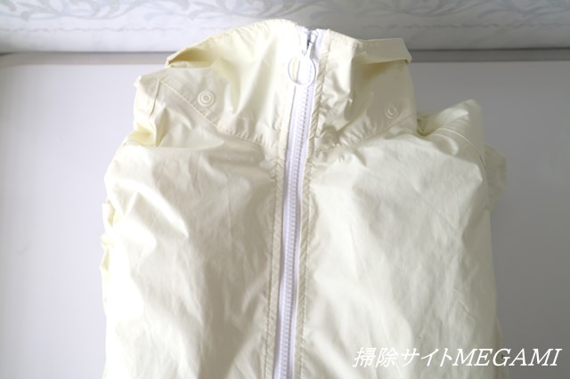 カッパのファスナーを閉め、収納式フードは取り出しておきます。