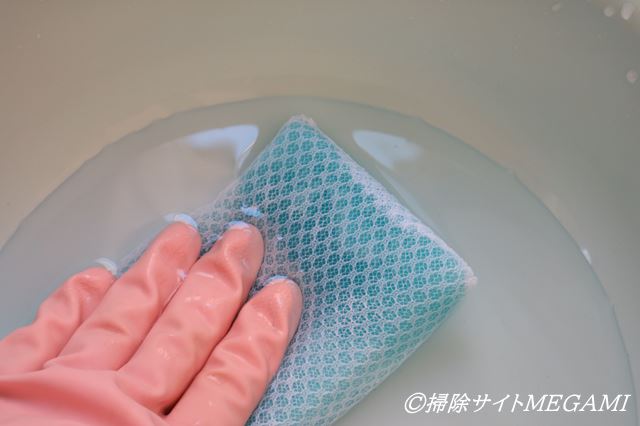 スポンジに水をたっぷり含ませ、絞り水で濯ぎ洗いするイメージ。古タオルで水受けしながら作業してくださいね。