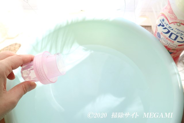 ●まず最初に、水(ぬるま湯)を入れた容器に、液を加え「洗剤水」を作ります。