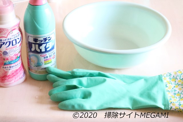 ※消毒には、塩素系漂白剤のハイター(衣料用)、もしくはキッチンハイターを使います。