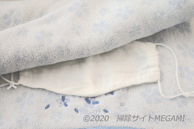 濯いだマスクを、清潔なタオルに挟み、余分な水気を吸い取る。