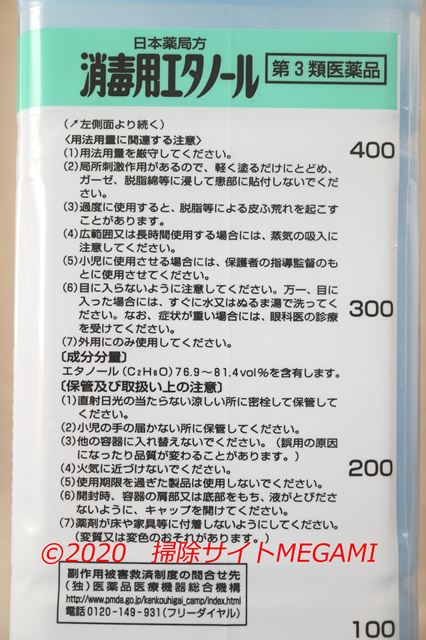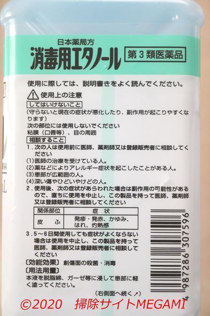 また、無水エタノールの容器には「消毒液」として使う場合の注意事項が書いてありません。