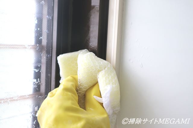 お風呂の窓枠に生えたカビは、泡のカビハイターを使うと、中まですっきりお掃除できる。