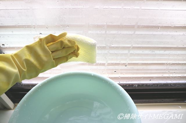 残った汚れは、水を含ませたスポンジで、こすり落とします。