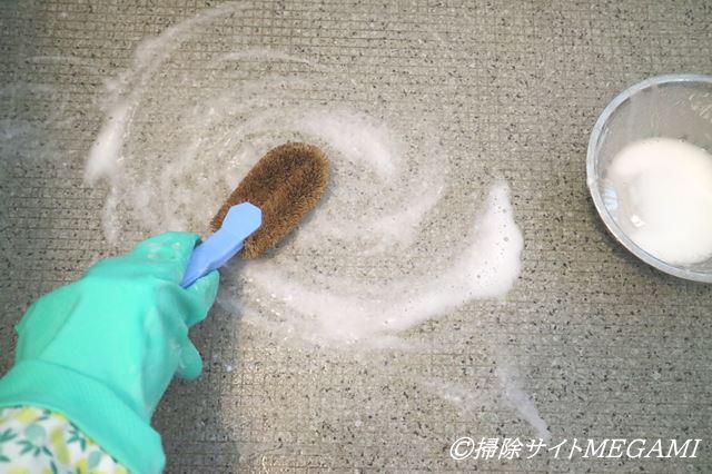 汚れがひどいときは、重曹クリームをぬって時間をおくとGOOD。重曹クリームは、重曹に水とボディーソープ(食器用洗剤)など石けん水を加えた手作り洗剤です。