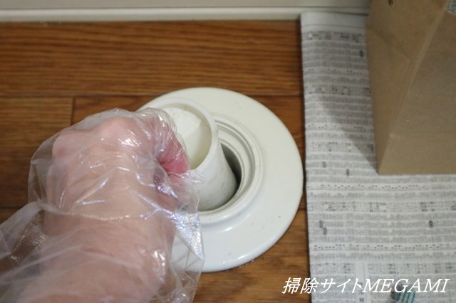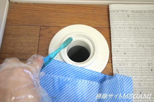 汚れがたまっている場合は、取り除きゴミ袋へ入れる(懐中電灯で照らすと見えやすい)。