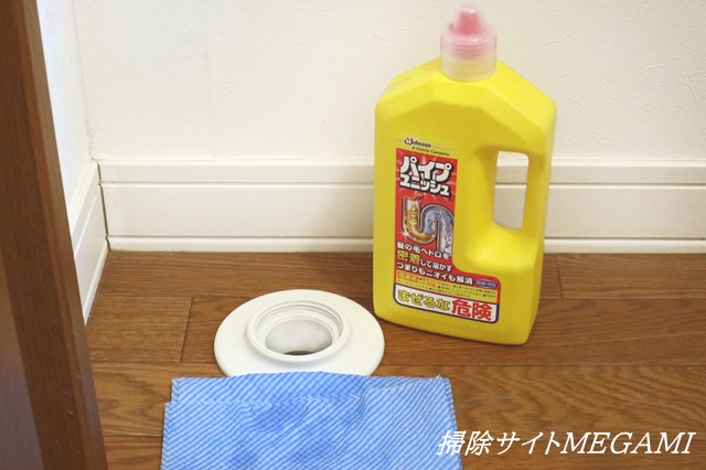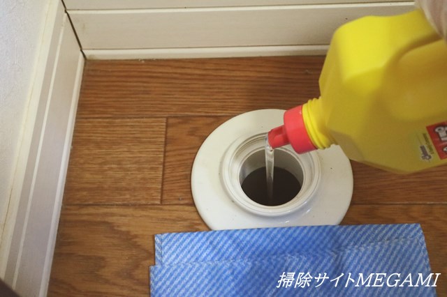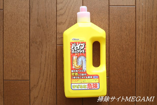 排水トラップの詰まりは、「パイプユニッシュ」などパイプ用の洗剤を使用します。