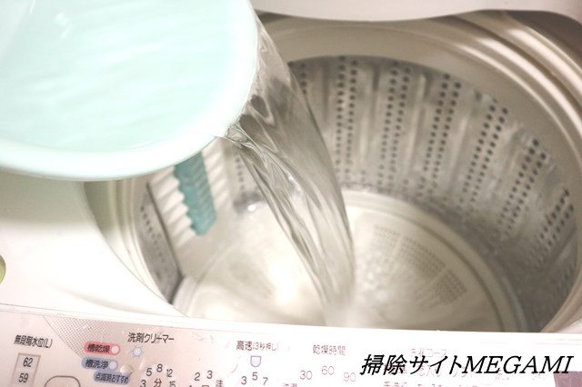 洗濯槽に水をため、重曹入りのお湯を入れます。