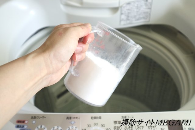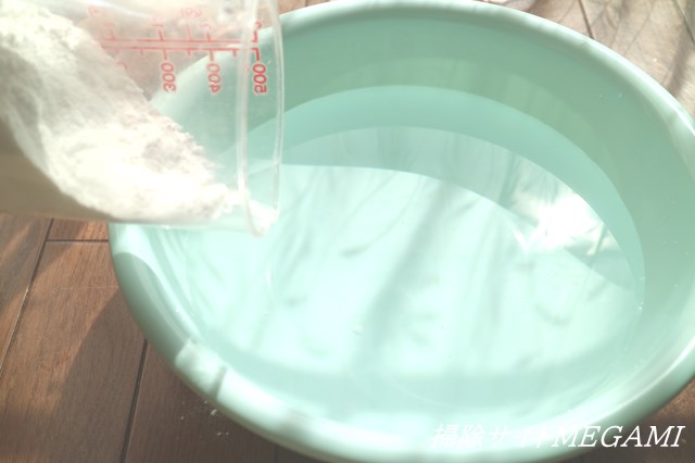 50度のお湯に重曹を溶かしてから、洗濯槽に入れる。