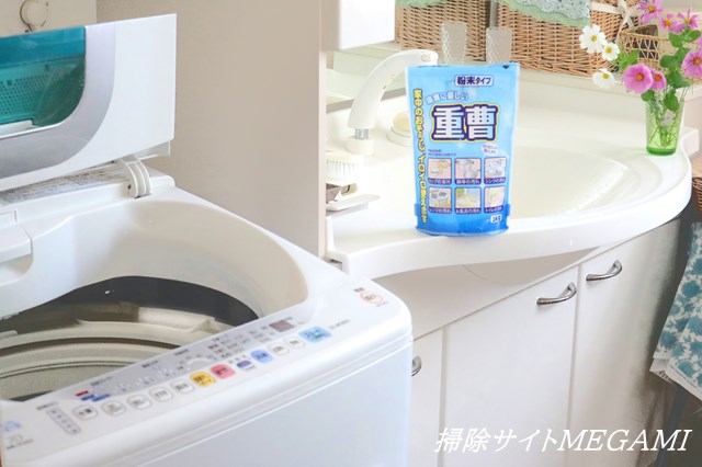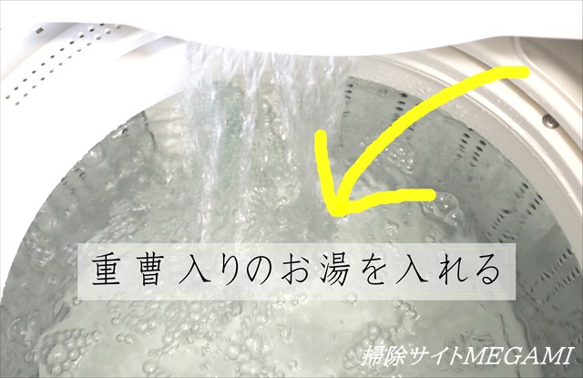 50度のお湯を洗濯槽に貯めて、そこに重曹を入れる。