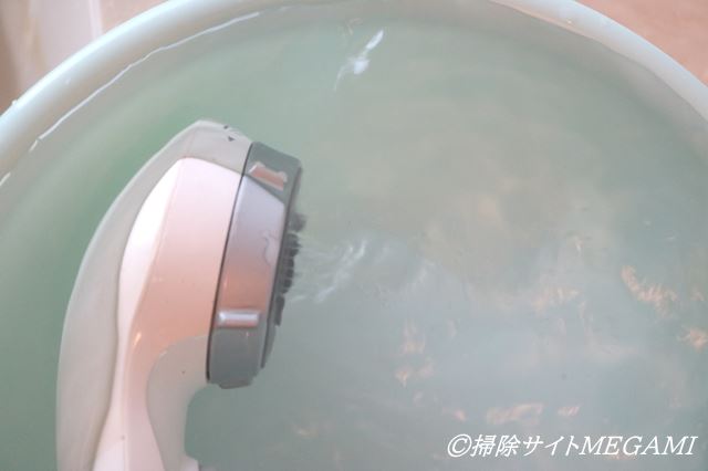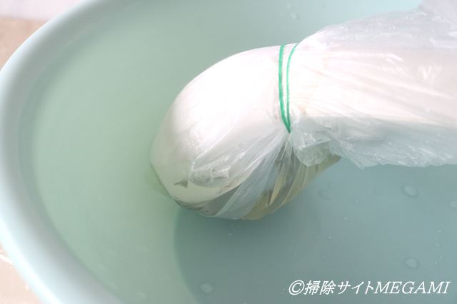 袋の中に、酢水とシャワーヘッドを入れ1〜3時間ほど漬けおきします。