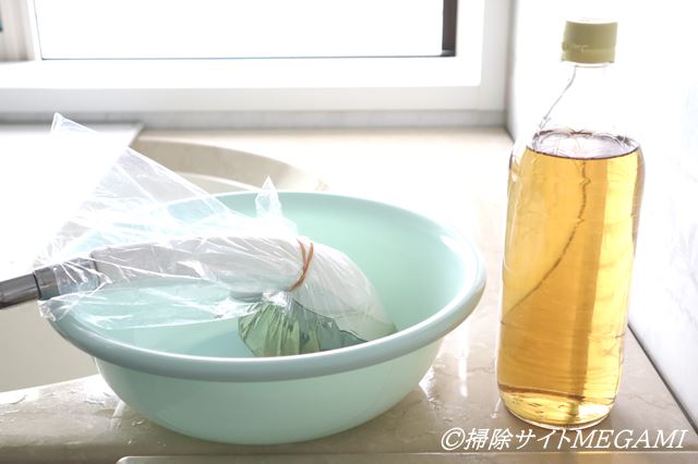 酢は水垢をやわらかくする性質があるので、漬け置くことで落としやすくなります。