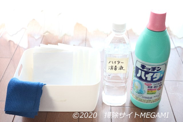 次に、ペーパークロスや布に、「ハイター消毒液(水で薄めたもの)」を含ませます。