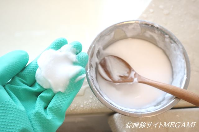 重曹は粉末よりも、水や石けん水を混ぜてクリーム状にするのがおススメ。