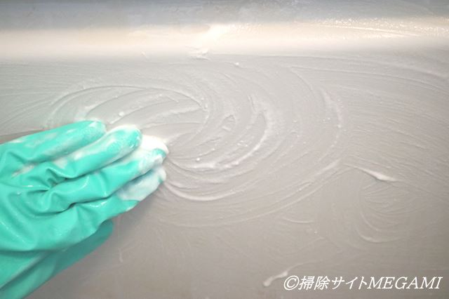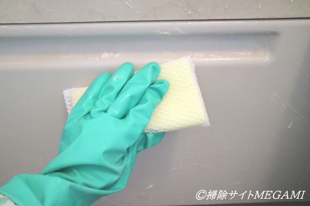 汚れがゆるんだら、スポンジでこすりおとします。 ごしごしすると傷がつくので、やさしく磨いてくださいね。