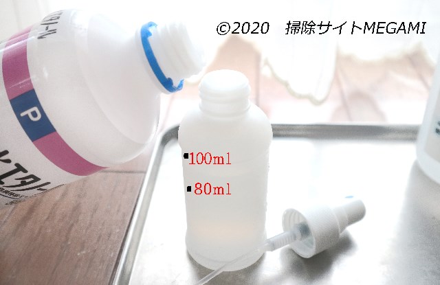 ※<分量について>覚えやすいよう4:1と表記していますが、無水エタノールは精製水と混ざると収縮し体積が少し減ります。そのため実際の精製水の量は20mlよりほんの少し多めに入ります。