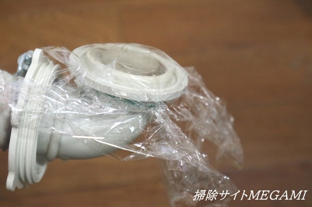 サランラップやビニール袋などでフタをしゴムで固定。出口をふさいだらホースを上げ下げして洗剤をいきわたらせる作戦です。